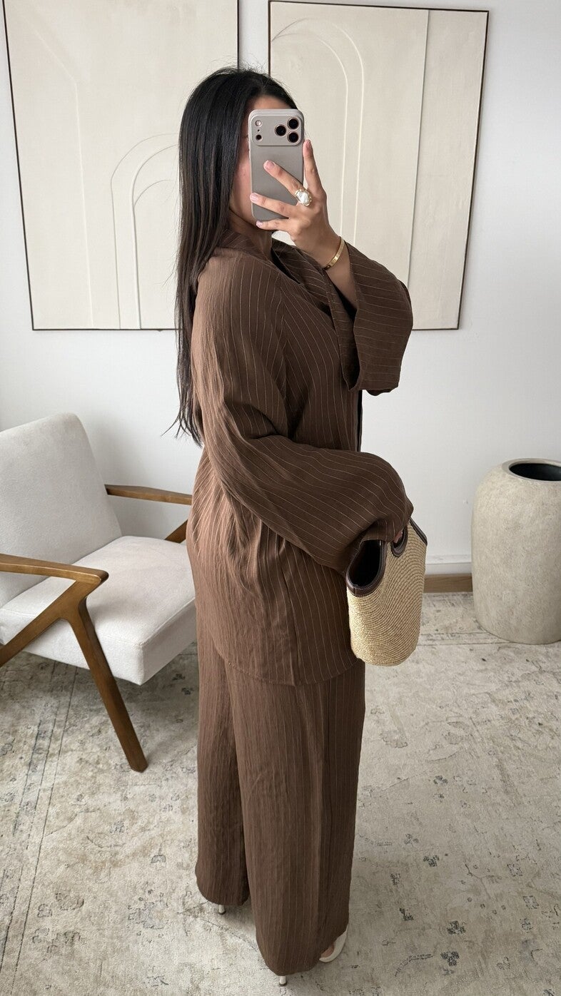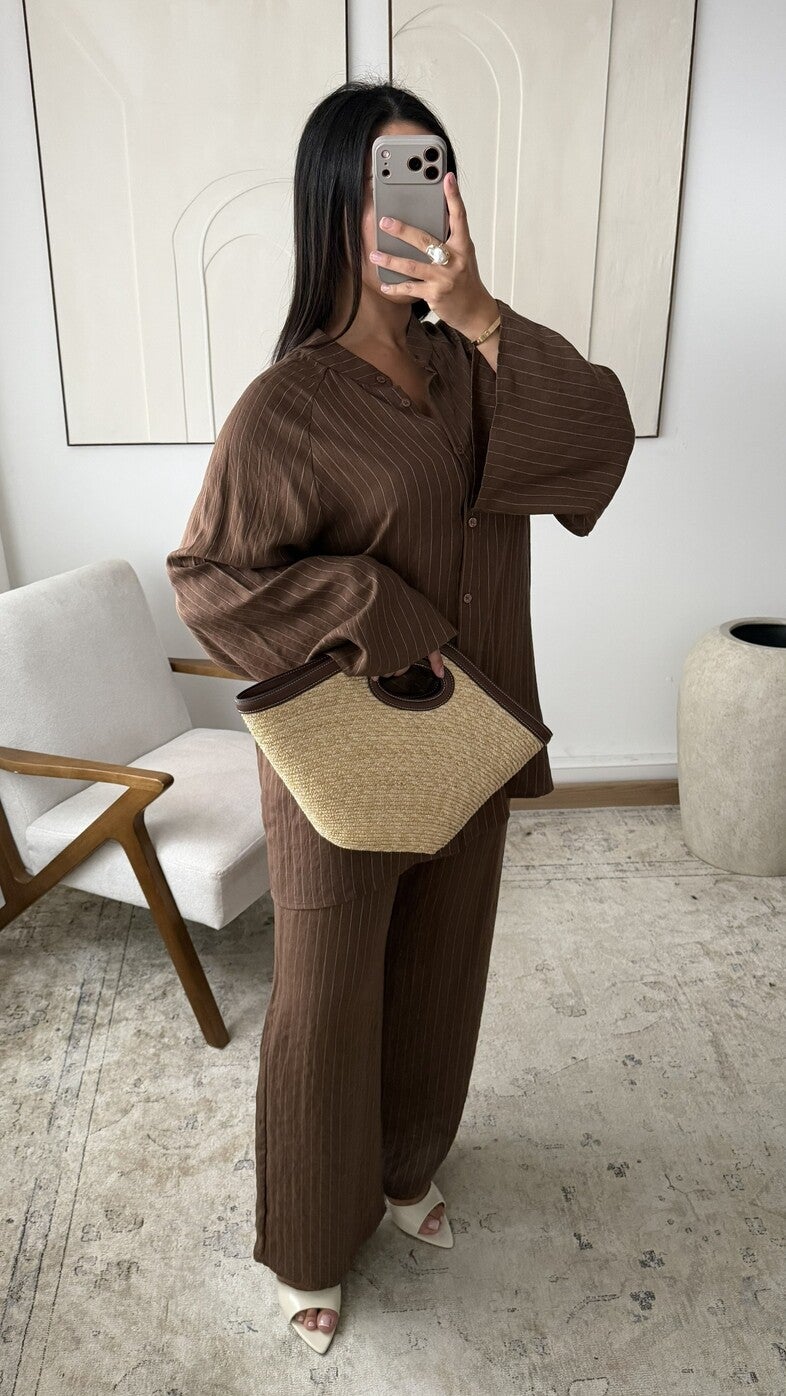 Tweedelig ensemble bestaande uit een ruime blouse met opstaande kraag en discrete knoopsluiting en wijde mouwen, gecombineerd met een bijpassende vloeiende broek, gemaakt van een stof met fijne verticale ton-sur-ton strepen die een elegante, harmonieuze en comfortabele silhouet biedt, geschikt voor een verfijnde dagelijkse outfit.