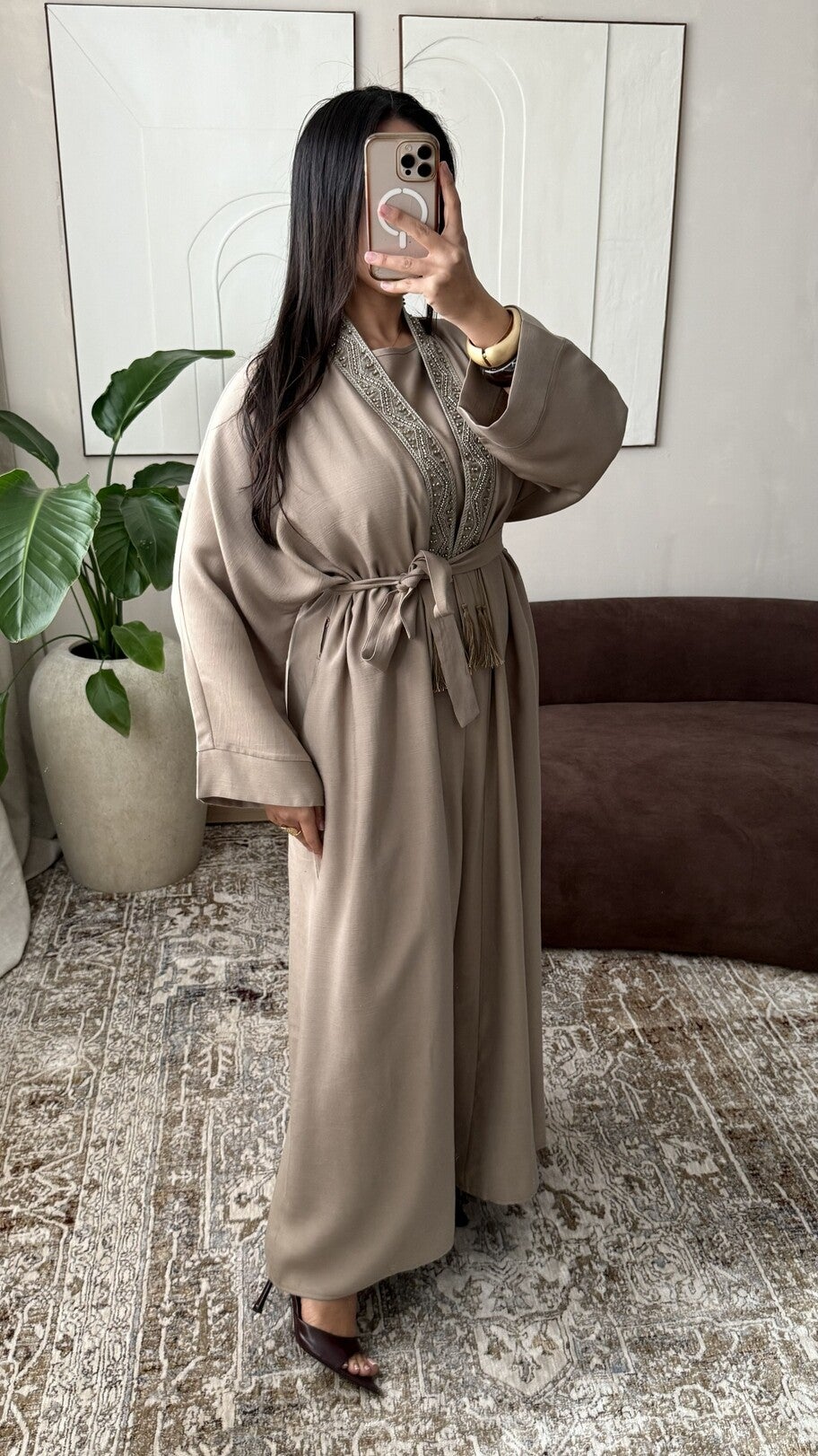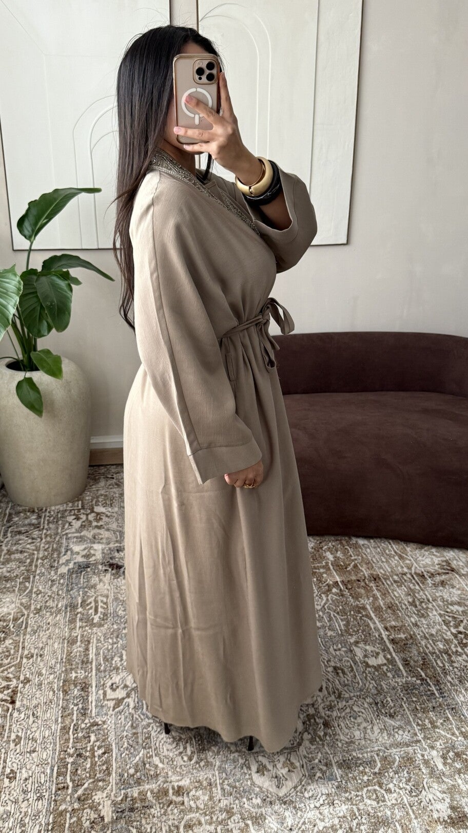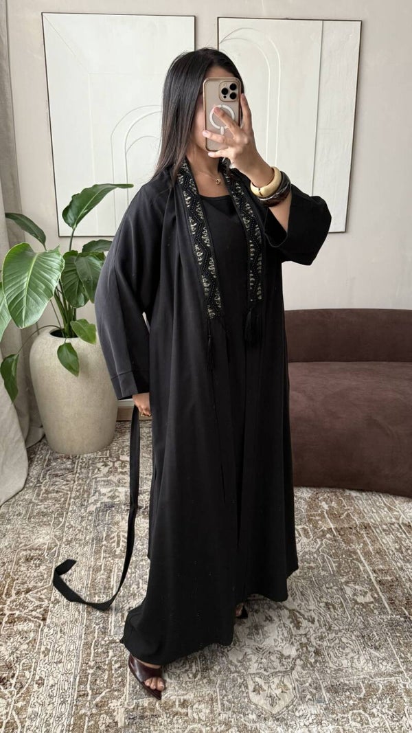 Tweedelige set bestaande uit een lange kimono en een bijpassende onderjurk die een ruime en elegante pasvorm biedt, gemaakt van kwalitatief materiaal met een vloeiende en gestructureerde val, verfraaid met delicate borduursels langs de kraag en voorzien van een ceintuur die bij de kimono wordt geleverd om het silhouet aan te passen voor een verfijnde en moderne uitstraling, geschikt voor klanten die op zoek zijn naar bedekkende en verfijnde kledingstukken