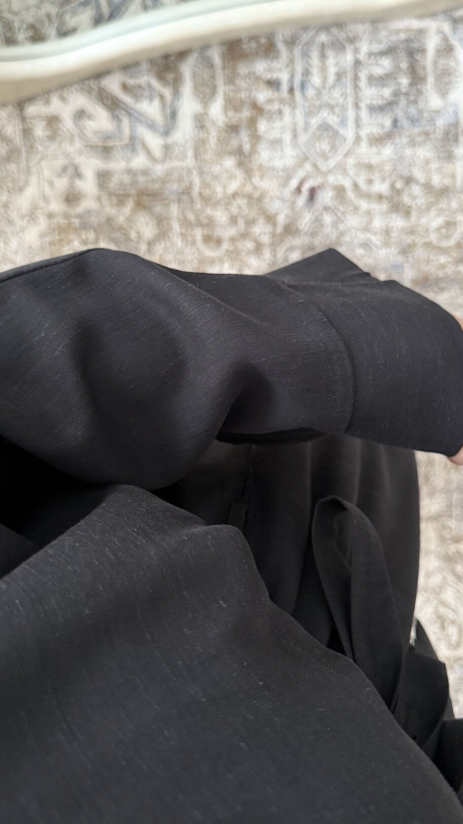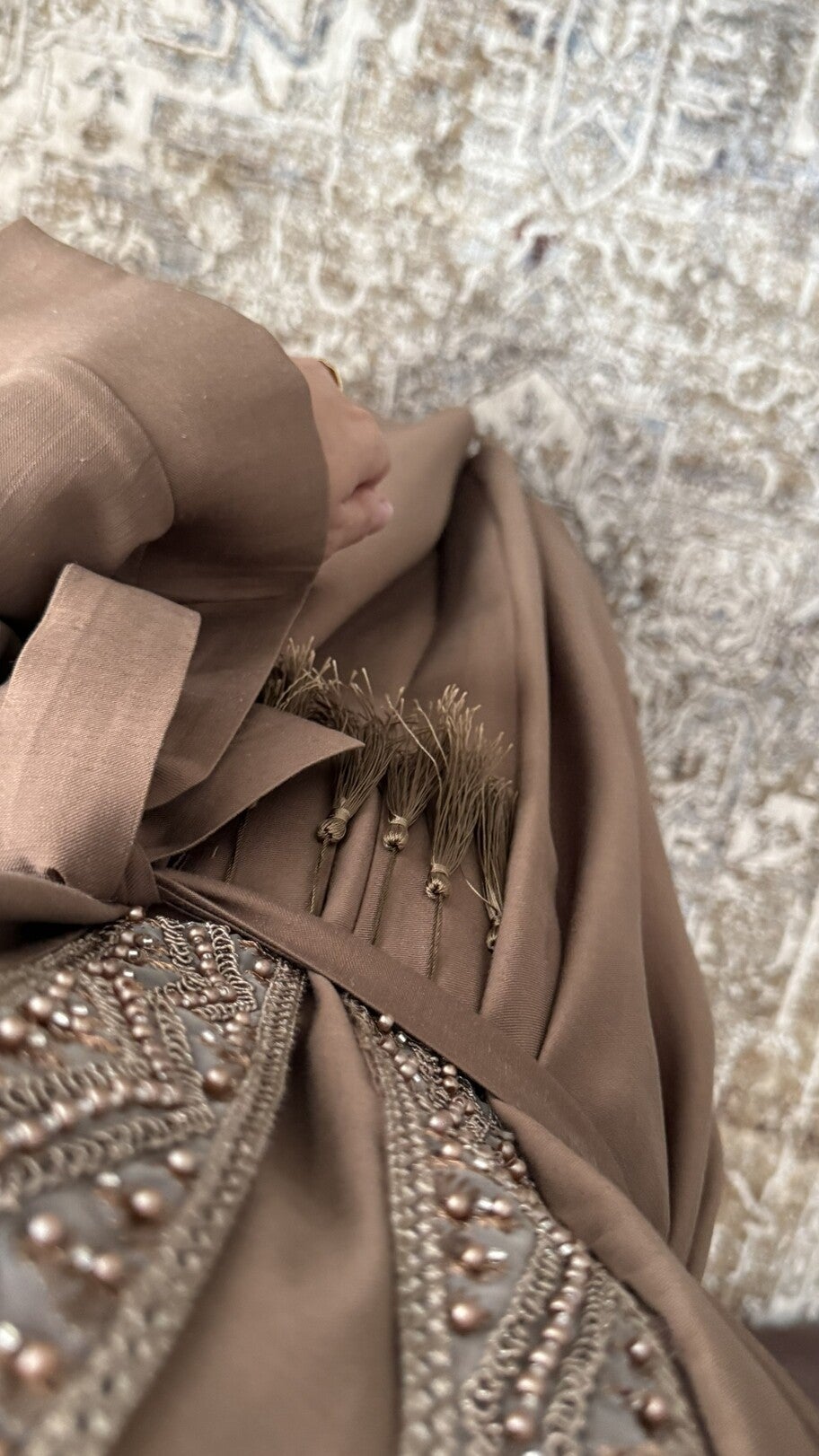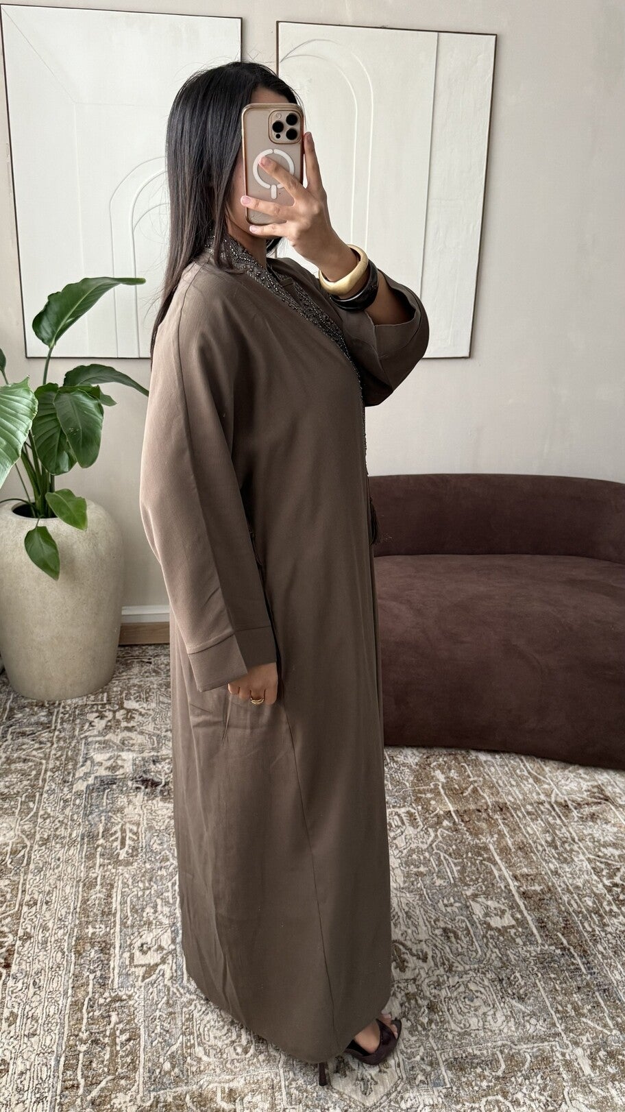 Tweedelige set bestaande uit een lange kimono en een bijpassende onderjurk die een ruime en elegante pasvorm biedt, gemaakt van kwalitatief materiaal met een vloeiende en gestructureerde val, verfraaid met delicate borduursels langs de kraag en voorzien van een ceintuur die bij de kimono wordt geleverd om het silhouet aan te passen voor een verfijnde en moderne uitstraling, geschikt voor klanten die op zoek zijn naar bedekkende en verfijnde kledingstukken