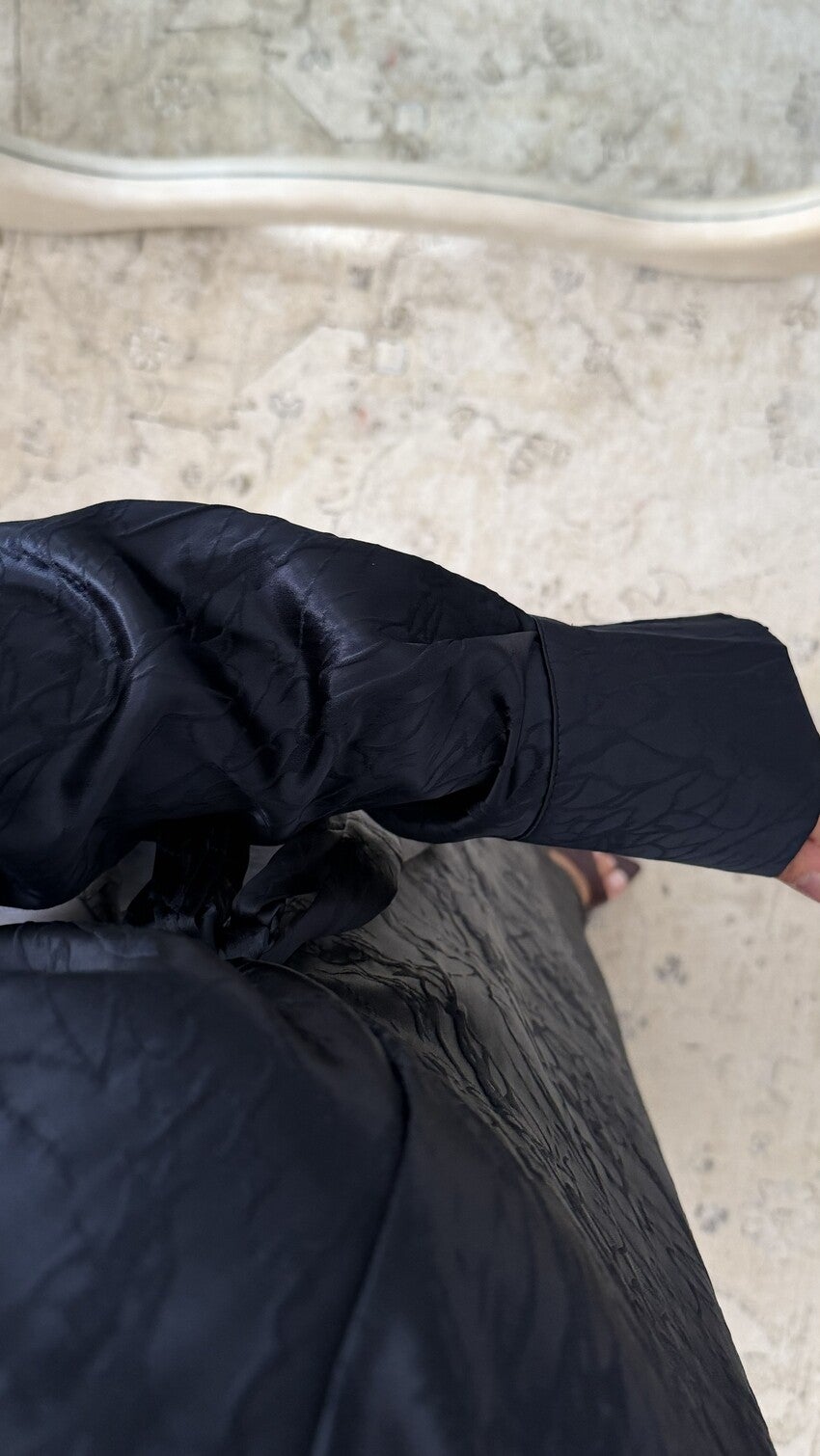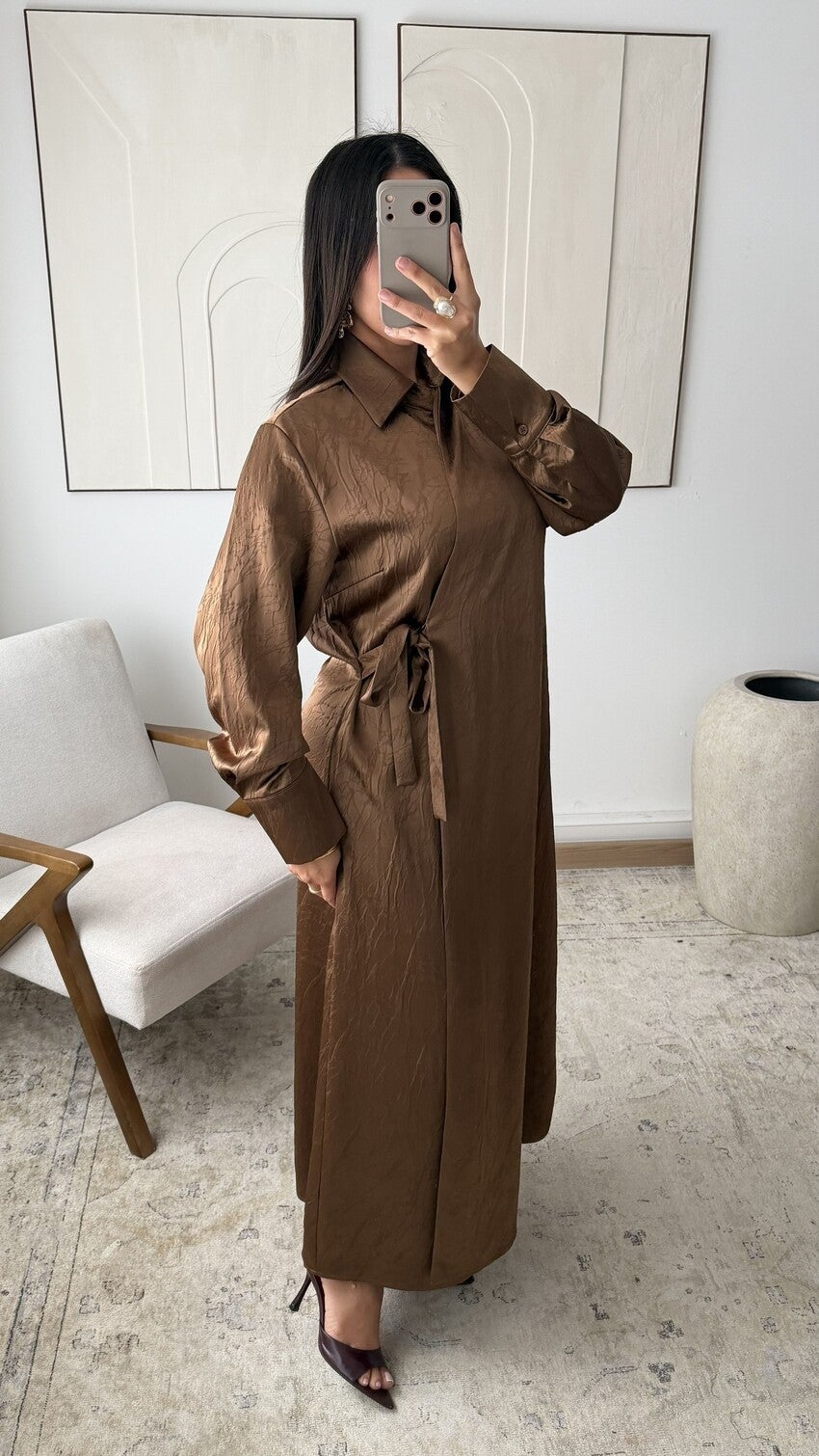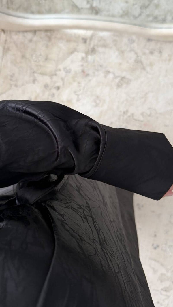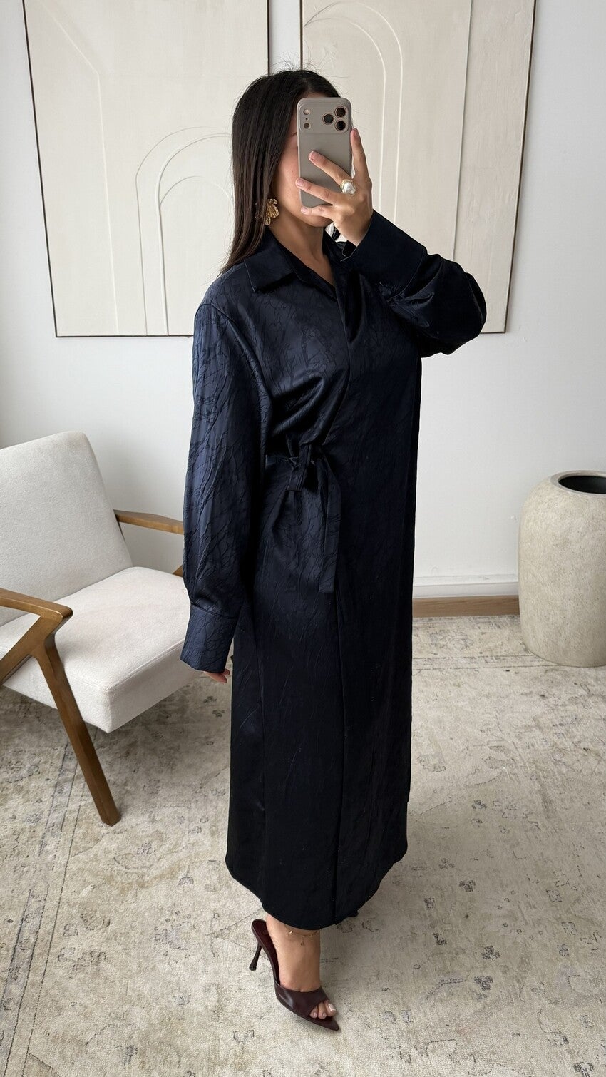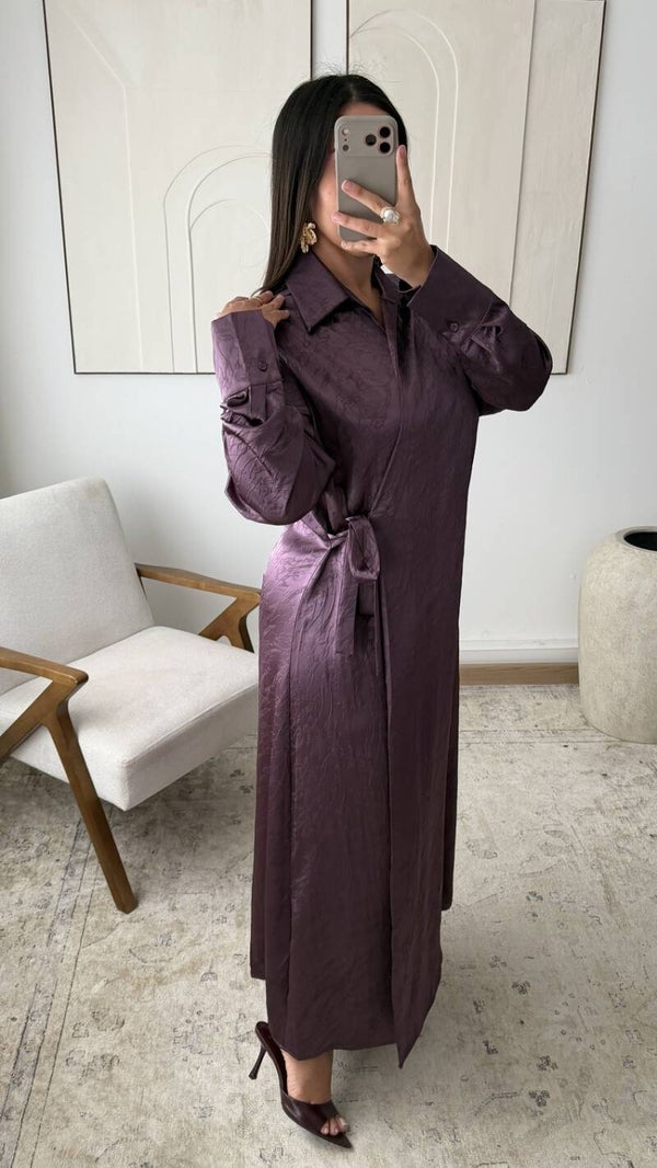 Elegante lange jurk met wikkel-effect en strik aan de zijkant, overhemdkraag en lange mouwen, gemaakt van een gestructureerde satijnen stof die een moderne en verfijnde silhouet biedt, ideaal voor een chique en eigentijdse collectie.