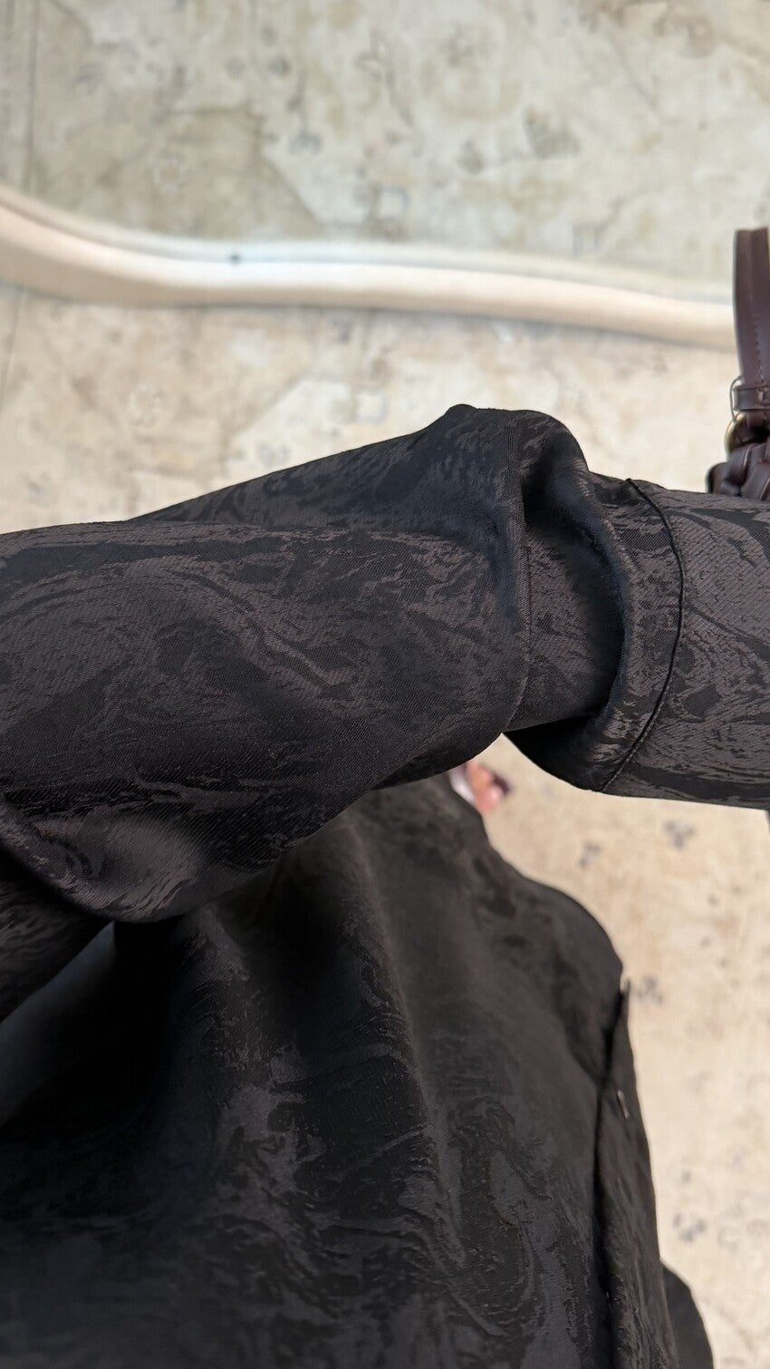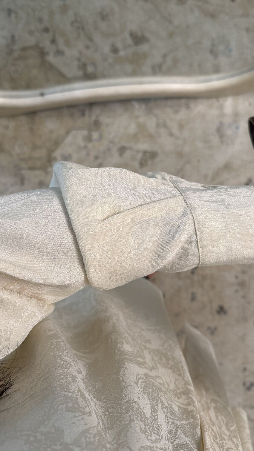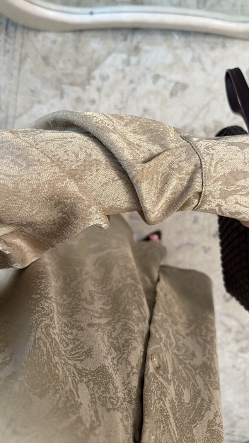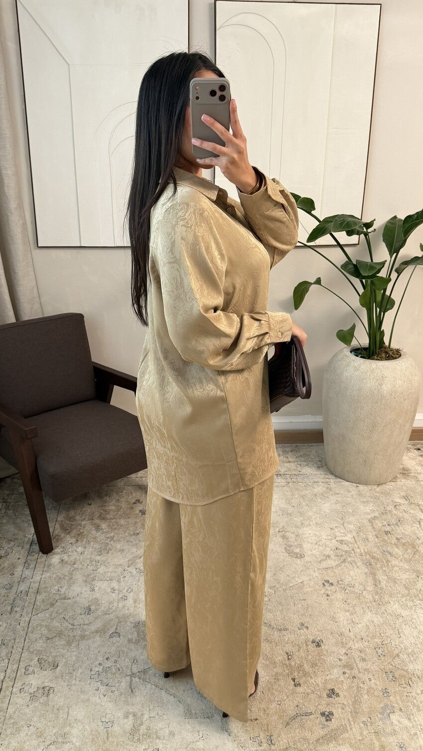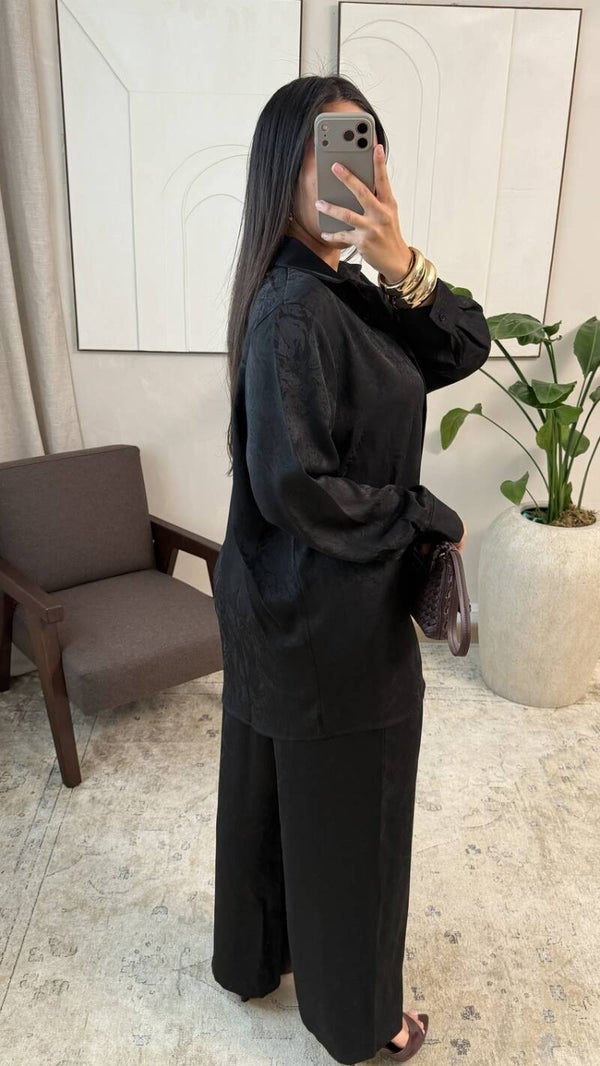 Set bestaande uit een oversized blouse met rechte pasvorm met overhemdkraag en lange mouwen, gecombineerd met een wijde broek voor een elegante en bedekkende val, van een satijnachtige stof met subtiel reliëf in ruitstructuur die stevigheid en een verzorgde afwerking biedt, en comfort en gemak biedt voor een modern en bescheiden silhouet, verkrijgbaar in meerdere kleuren.